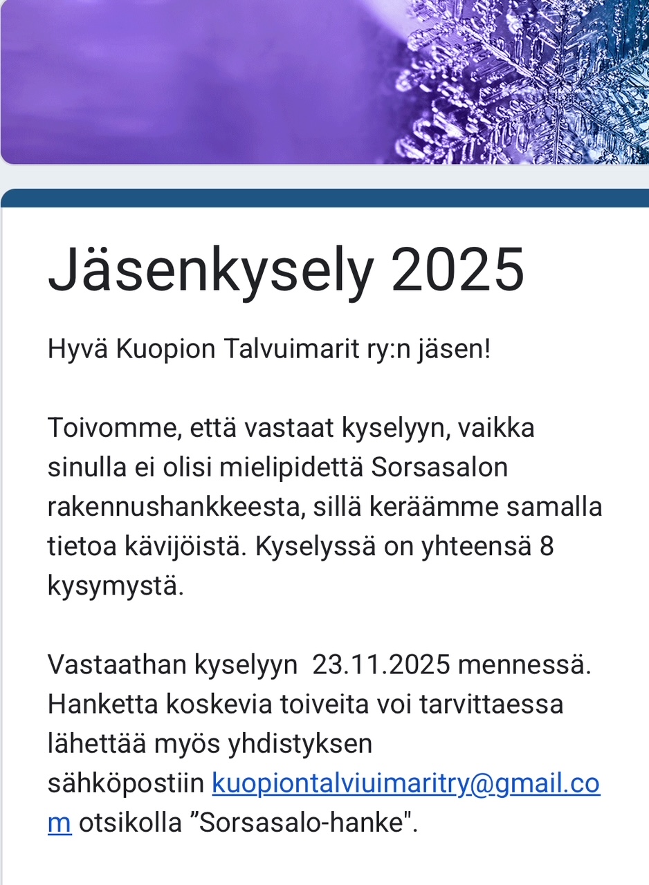Mikäli et ole saanut kyselyä sähköpostiisi, kurkkaathan myös mainokset ja roskapostit? Mikäli viestiä ei silti näy, laitathan meille sähköpostia: kuopiontalviuimaritry@gmail.com niin lähetämme viestin ja linkin kyselyyn.