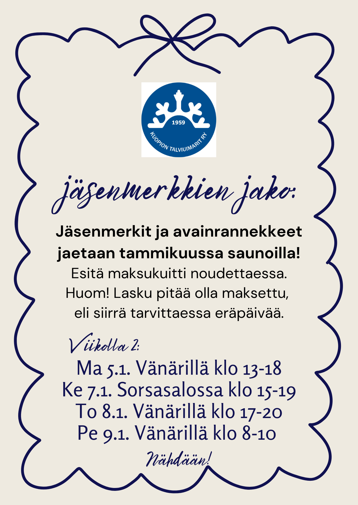 Jäsenmerkkien ja uusien jäsenten Väinölänniemen rannekkeiden jako alkaa maanantaina 5.1., haettaessa esitetään jäsenmaksun kuitti. Laskujen eräpäivä on 11.1.2026, eli jos haluat merkin ennen sitä, muuta eräpäivä ja maksa lasku aiemmin. Merkit jaetaan viikoilla 2-4. Tarkista jakopäivät ja -paikat verkkosivuiltamme.