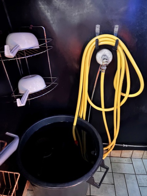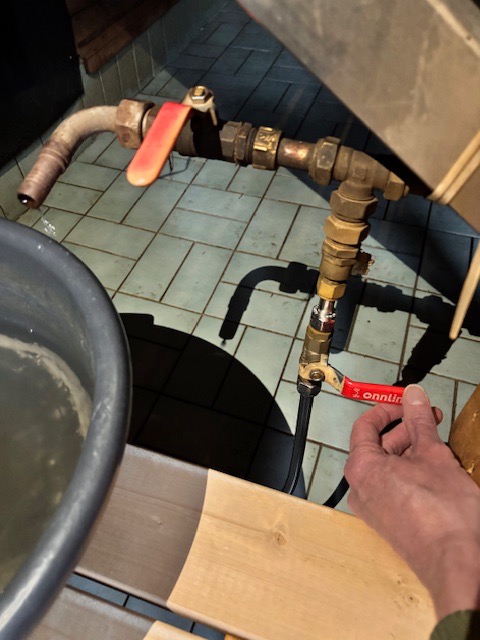 Kiukaan yläpuolella olevaan säiliöön vettä lisätään pesupaikan oikeasta laidasta (kuva alla).