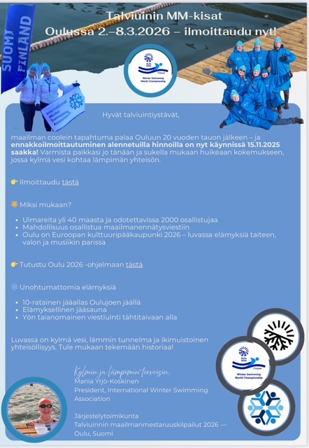 Kilpailut saatiin Suomeen pitkän suunnittelun ja työn tuloksena, ja se kertoo paljon siitä, miten arvostettu ja vahva talviuintikulttuuri meillä on. Tämä on koko suomalaisen talviuintiyhteisön voitto ja tilaisuus, jota ei kannata jättää väliin!