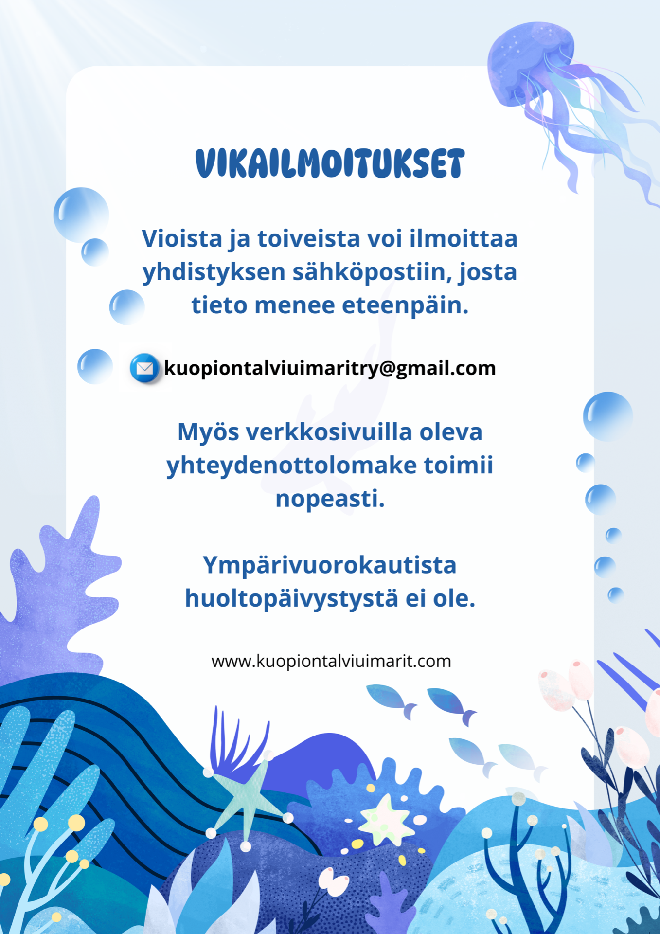 Tätä kautta tietoa saadaan mahdollisimman nopeasti oikealle taholle. Tieto menee eteenpäin viimeistään seuraavana arkiaamuna. Ympärivuorokautista päivystystä meillä ei ole.